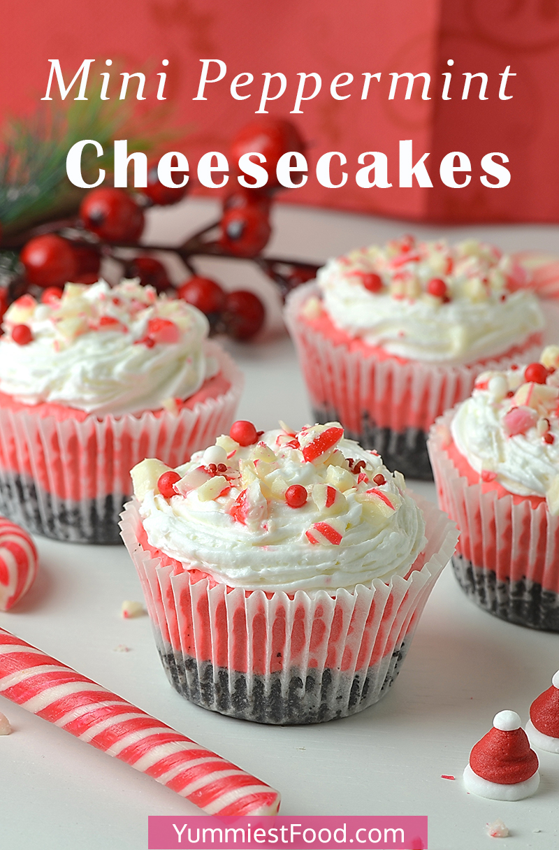 Mini Peppermint Cheesecakes with Oreo crust, festive red filling, whipped cream, and crushed peppermint candies are creamy and perfect for New Year eve’s!