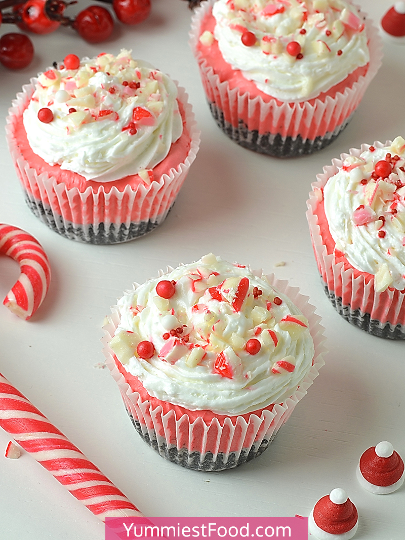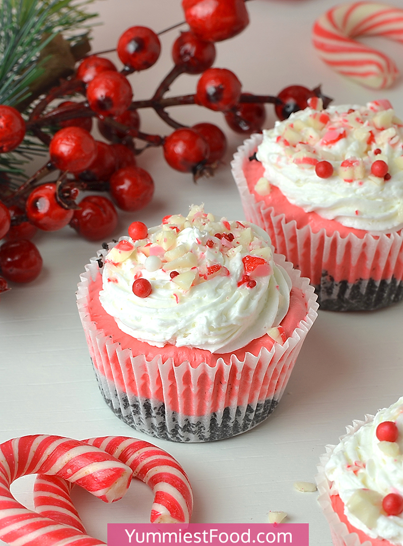 Mini Peppermint Cheesecakes with Oreo crust, festive red filling, whipped cream, and crushed peppermint candies are creamy and perfect for New Year eve’s!